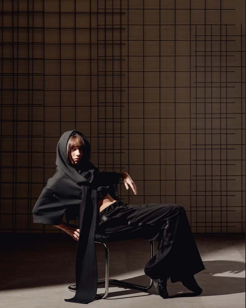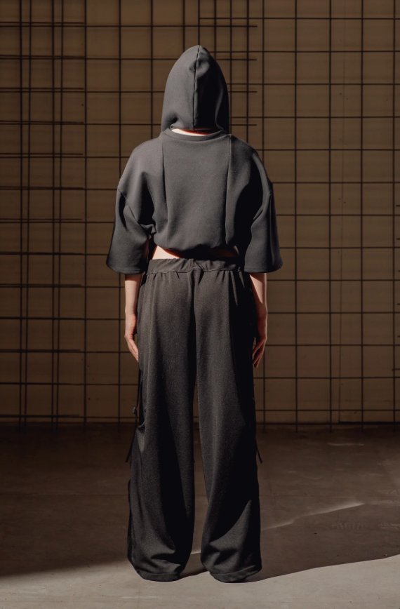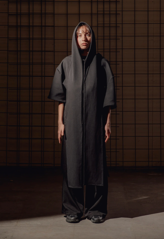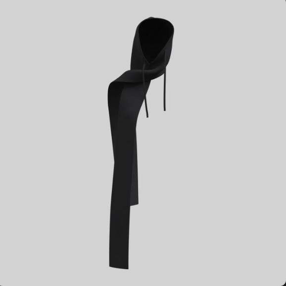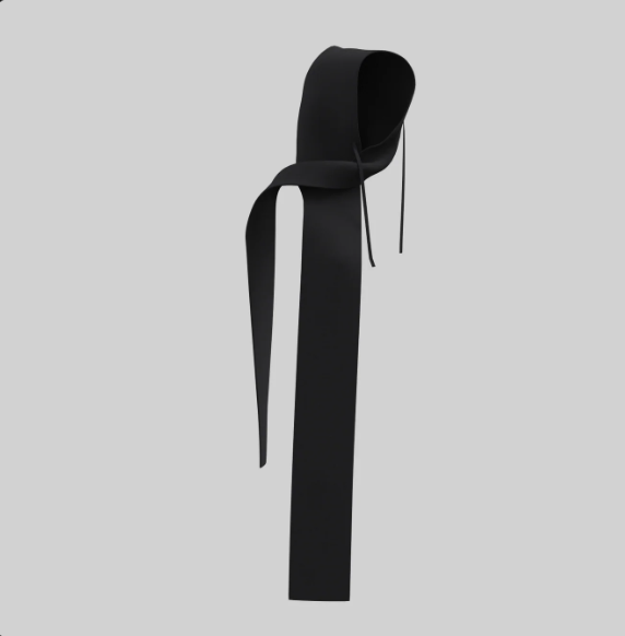 Hybrid between a hood and a scarf, adjustable through tightening strings on the hood.