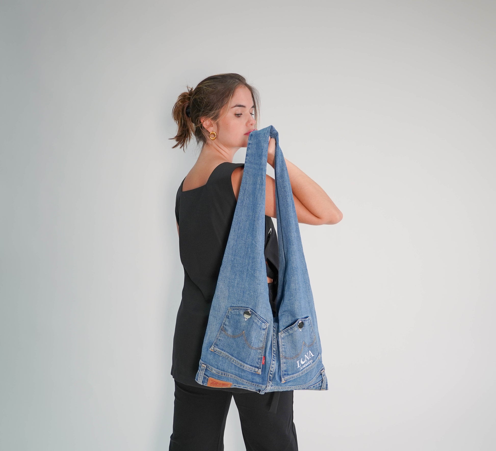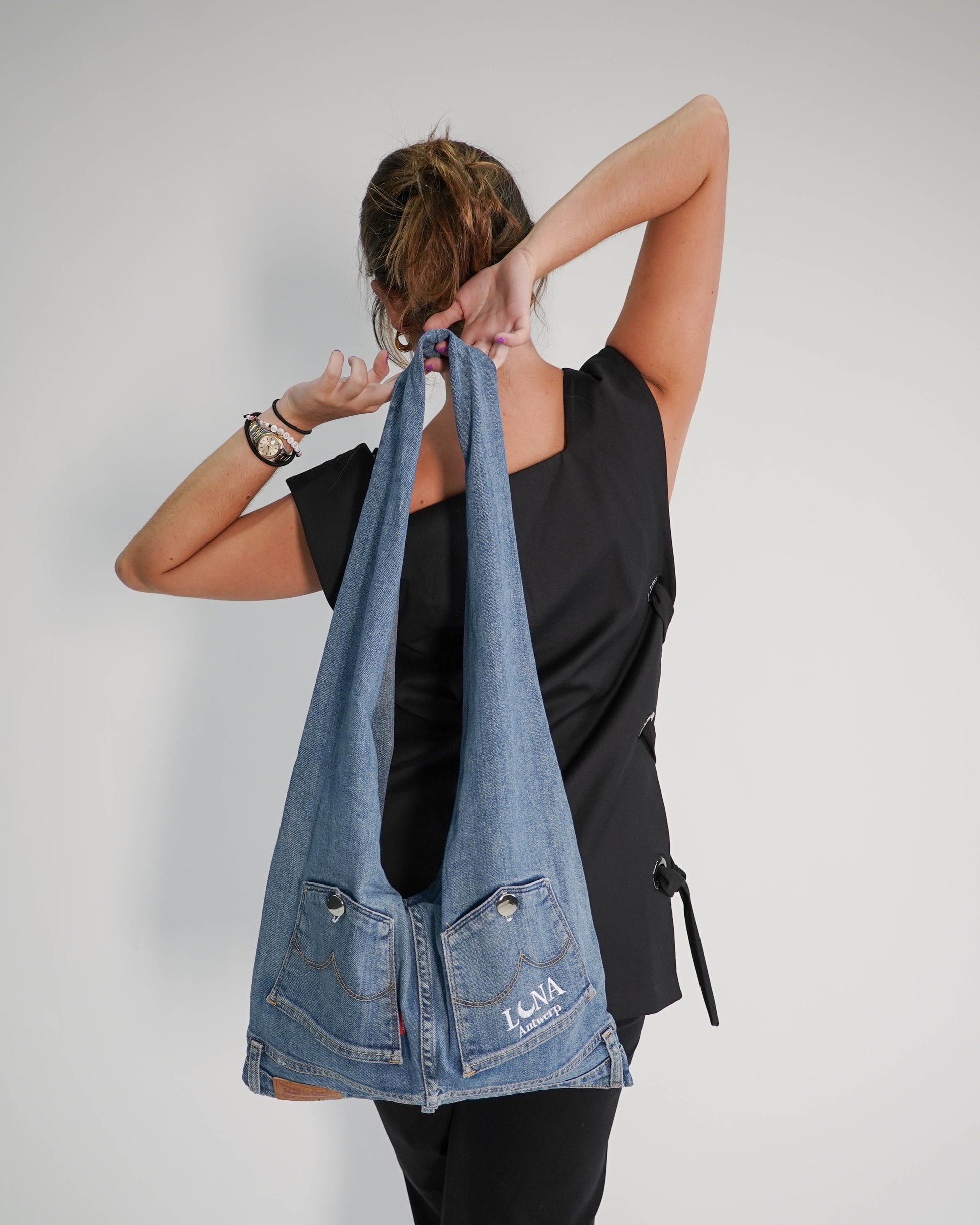 Bag handcrafted from upcycled jeans, thoughtfully sourced from thrift by Luna Antwerp.