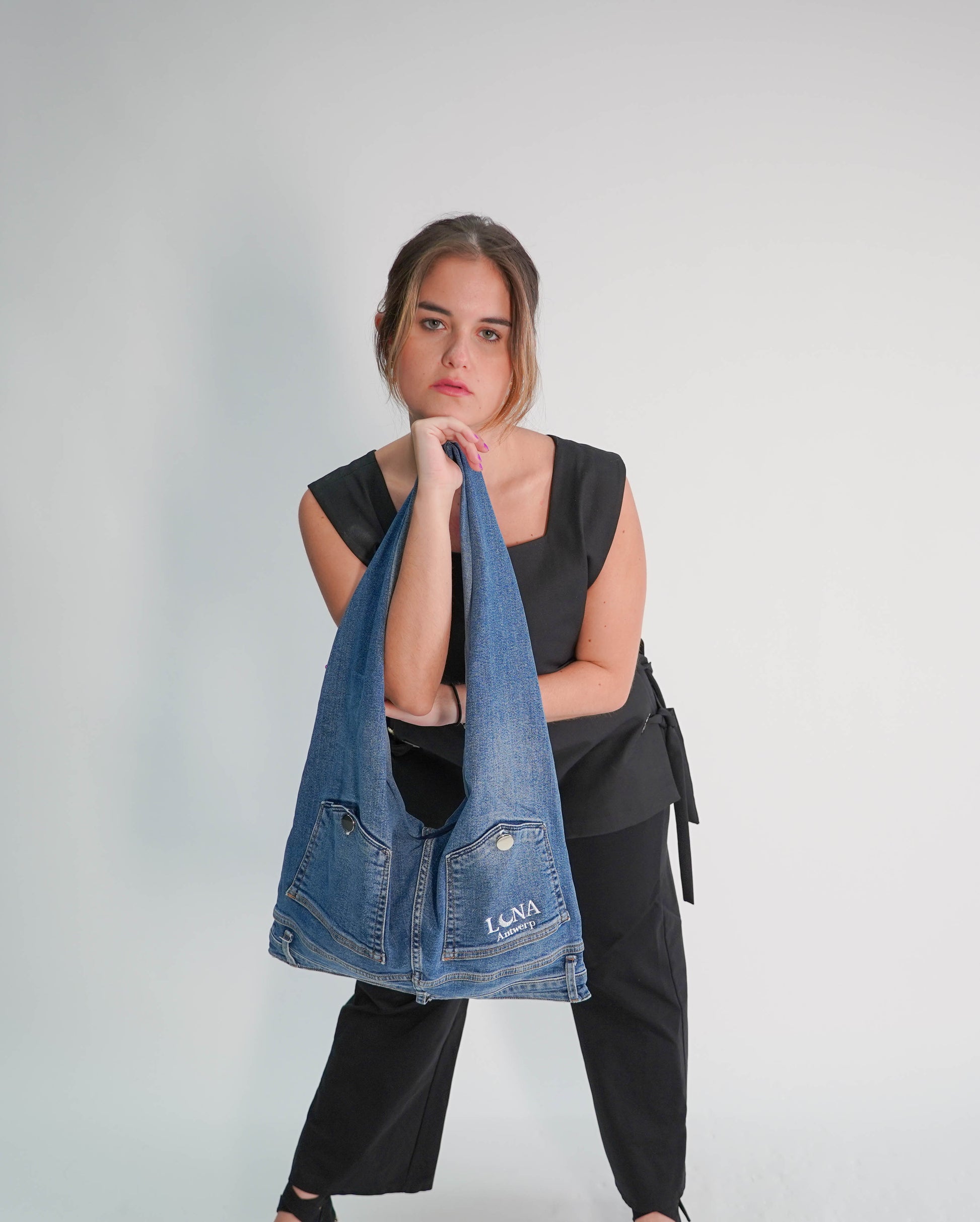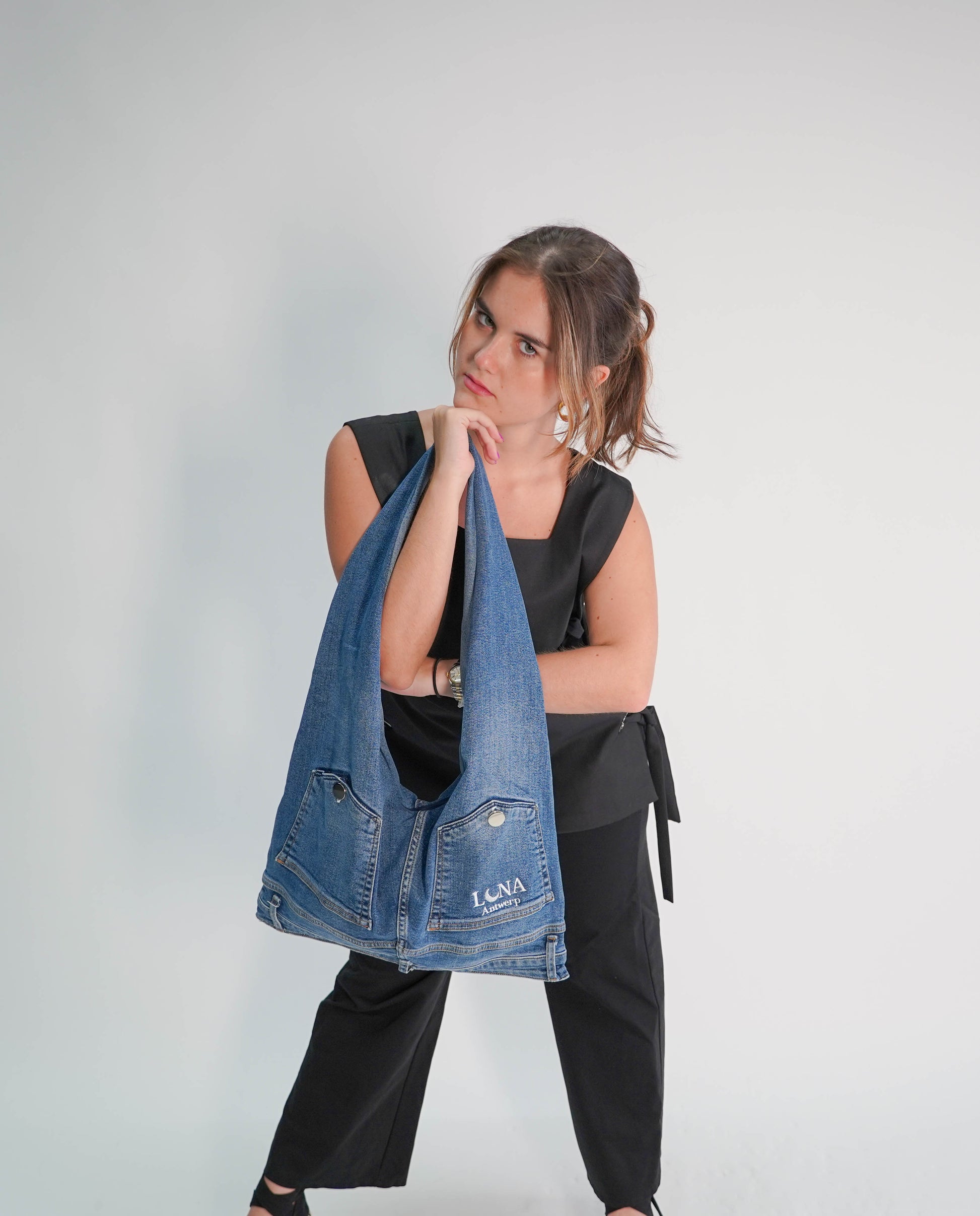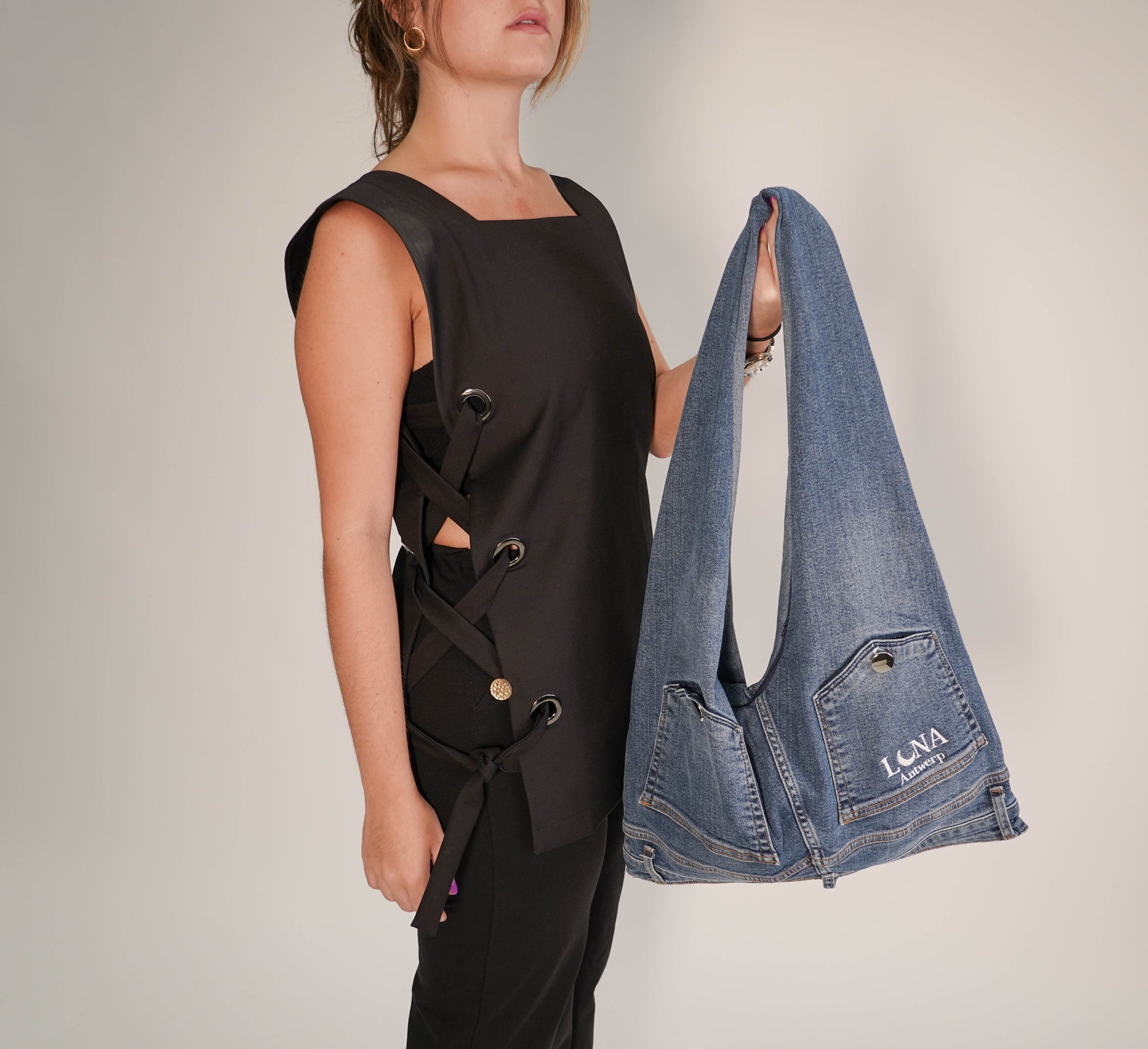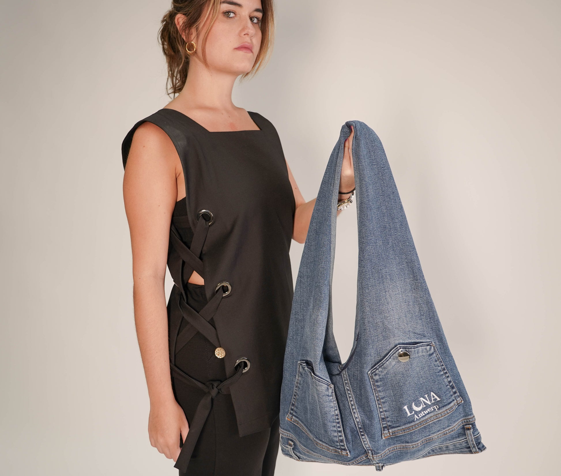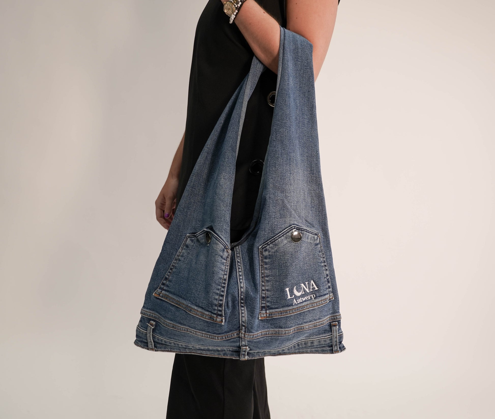 Bag handcrafted from upcycled jeans, thoughtfully sourced from thrift by Luna Antwerp.
