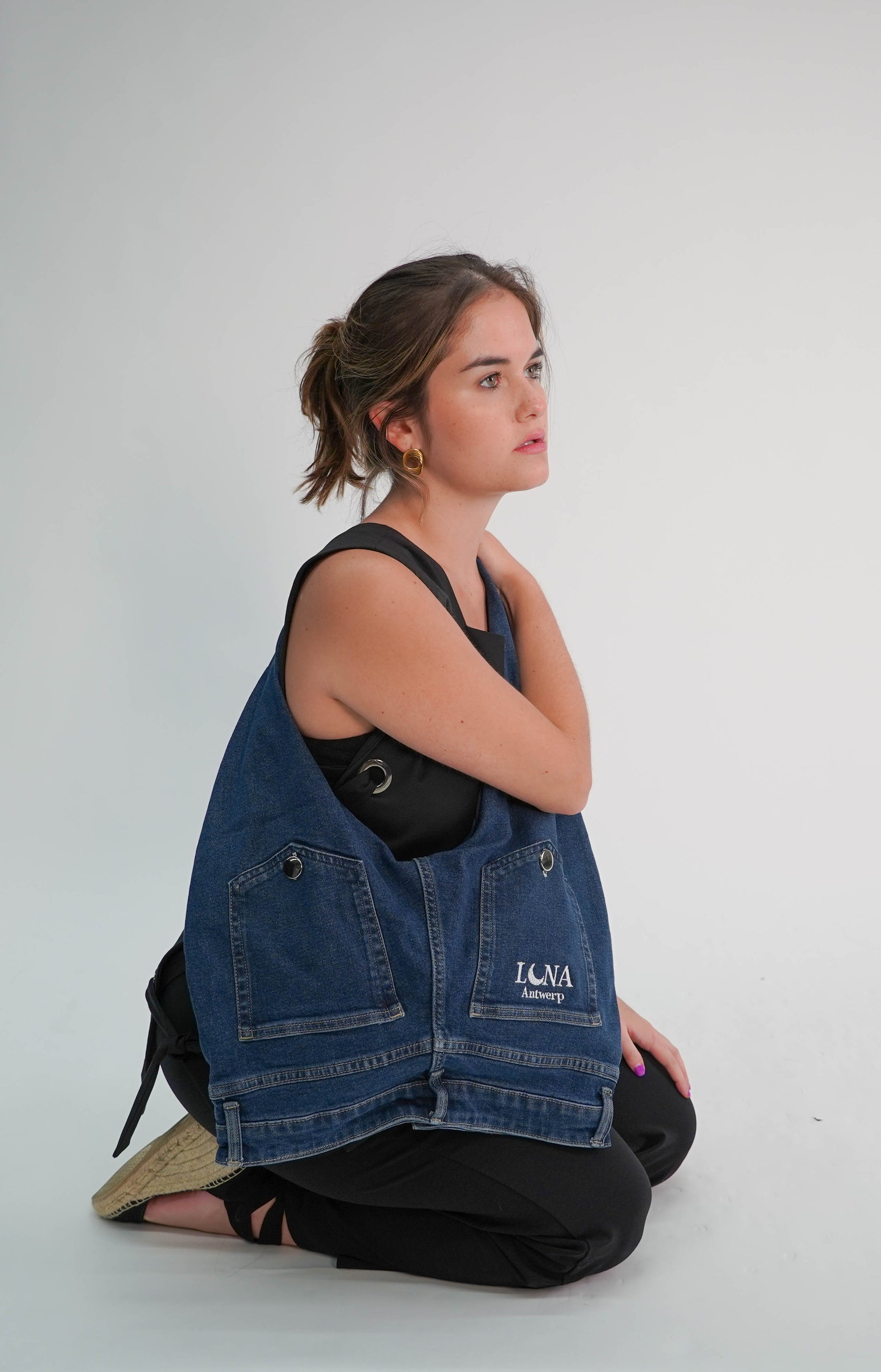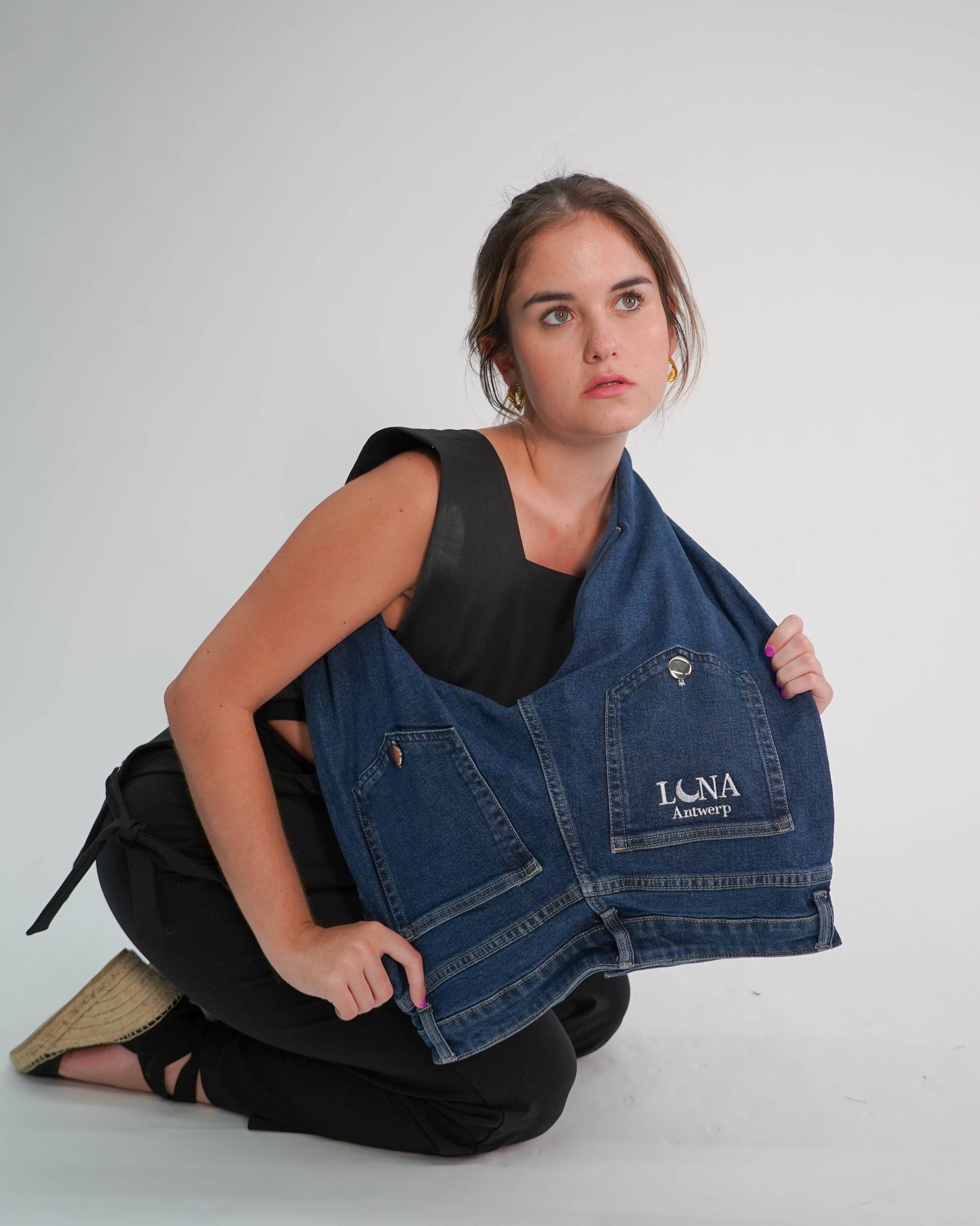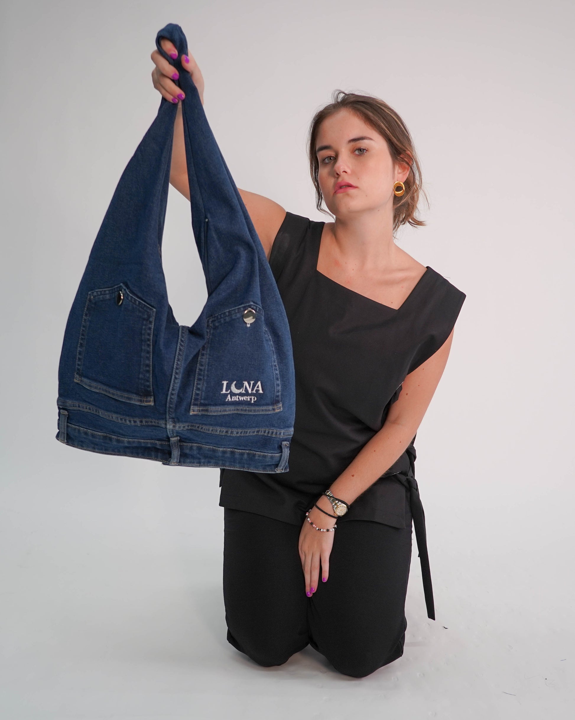 Bag handcrafted from upcycled jeans, thoughtfully sourced from thrift by Luna Antwerp.
