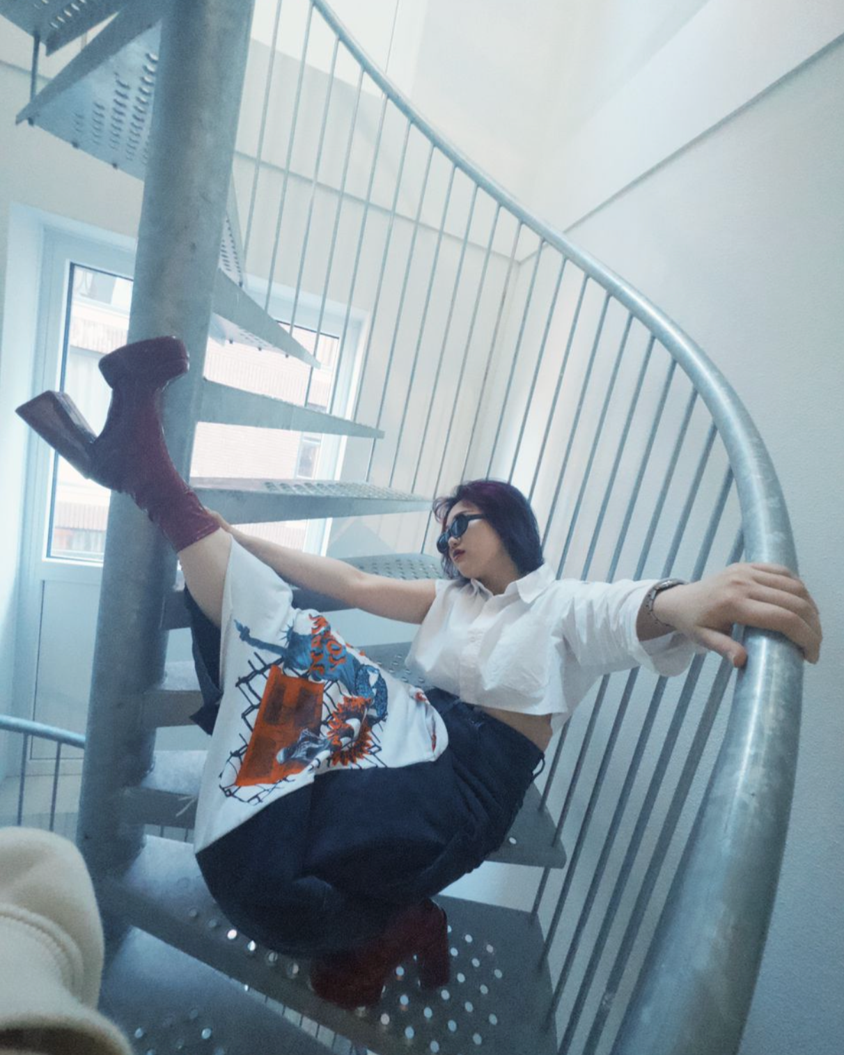 This piece emerges from an upcycling process where the original T-shirt was deconstructed and reimagined with other garments. The left panel was transformed into a cropped silhouette, while the shoulder was reshaped to add sculptural volume — creating a bold, asymmetrical one-sleeve design that feels both effortless and avant-garde.