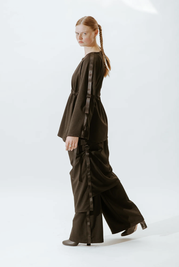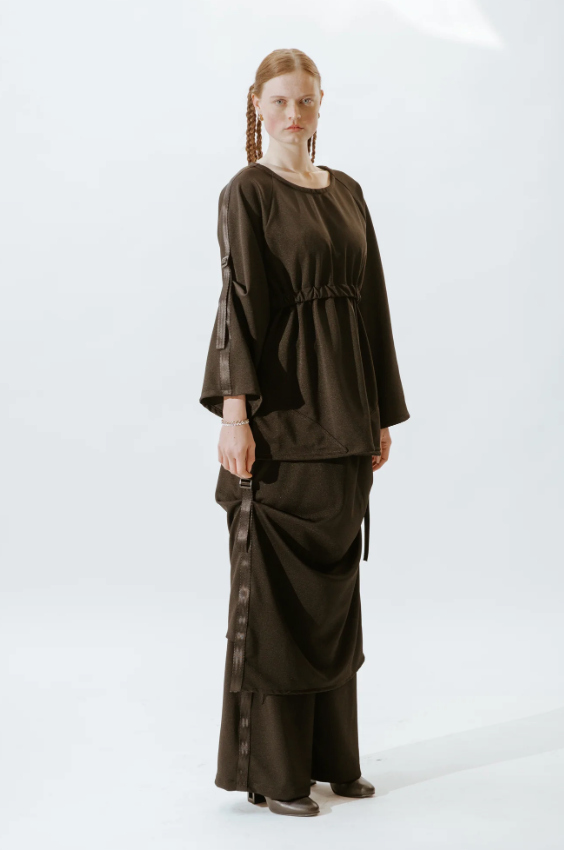 A minimalist rectangle-shaped skirt designed with signature O.22. adjustable side belts, allowing for a personalization of fit a minimalist rectangle-shaped skirt.