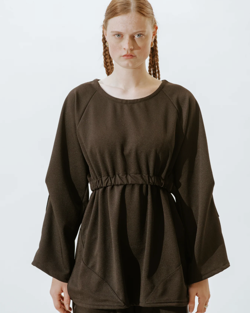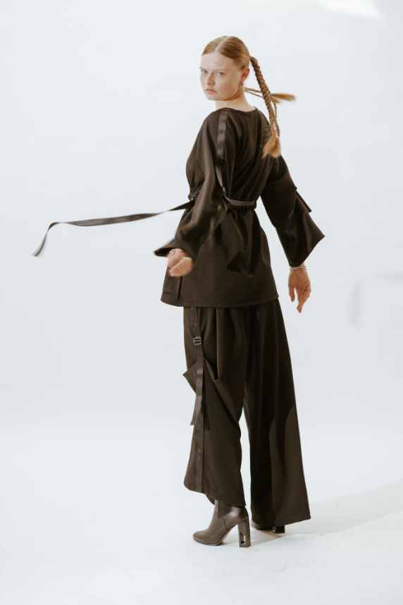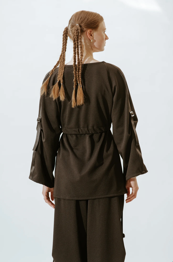 Loose fitted shirt with signature O.22 belts on the sleeves and a waist belt to adjust the fit.